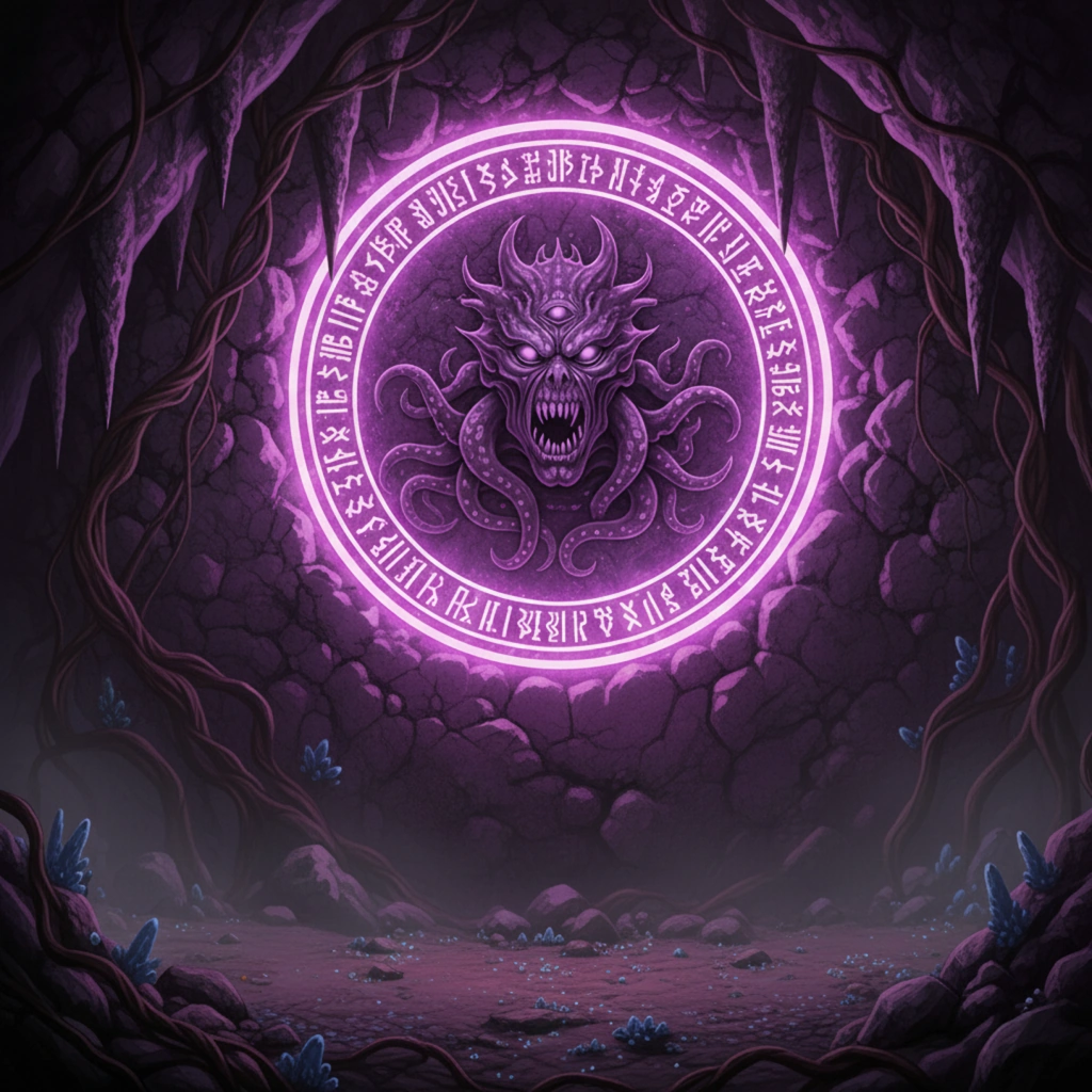 Following the sparks, they enter a hidden cave. Inside, the source is clear: an ancient purple seal, glowing faintly, embedded in a stone wall. Strange, foreign scriptures spiral around its edges, and in the centerāa grotesque depiction of a monstrous entity.